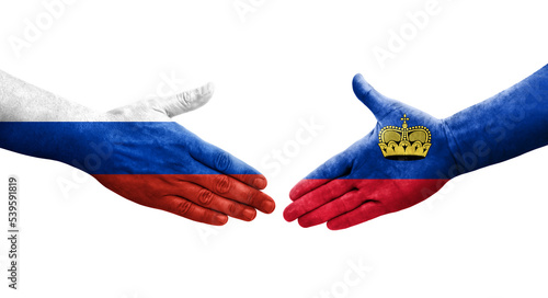 Handshake between Liechtenstein and Russia flags painted on hands, isolated transparent image.