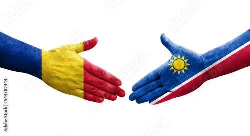 Handshake between Namibia and Romania flags painted on hands, isolated transparent image.