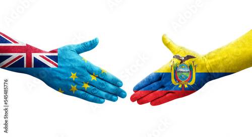 Handshake between Tuvalu and Ecuador flags painted on hands, isolated transparent image.