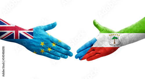 Handshake between Tuvalu and Equatorial Guinea flags painted on hands, isolated transparent image.