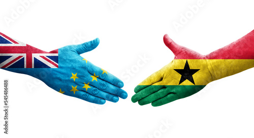 Handshake between Tuvalu and Ghana flags painted on hands, isolated transparent image.