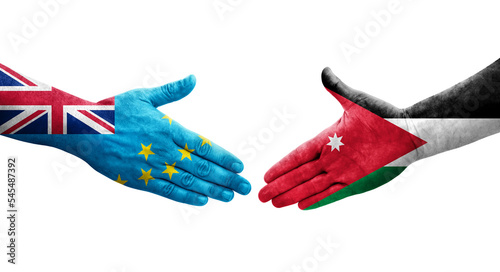 Handshake between Tuvalu and Jordan flags painted on hands, isolated transparent image.