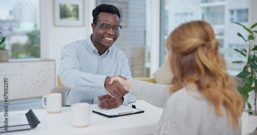 Handshake, contract and consulting with lawyer and client for planning, signature or deal. Financial advisor, legal documents and agreement with black man and woman in law firm for life insurance