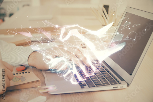 Handshake hologram drawing with businessman working on computer on background. Double exposure.