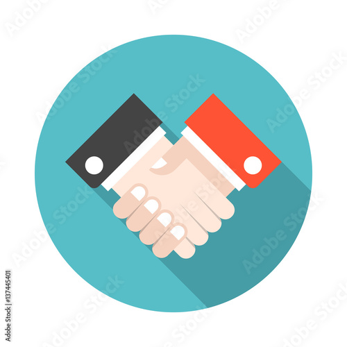 Handshake icon with long shadow. Flat design style. Round icon. Handshake silhouette. Simple circle icon. Modern flat icon in stylish colors. Web site page and mobile app design vector element.