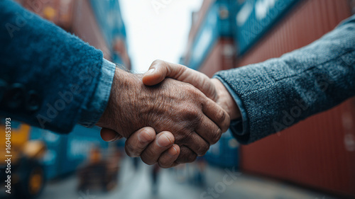 Handshake negotiation policy agreement between two business people in shipping container yard for successful deal