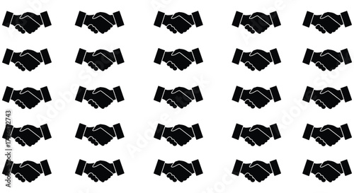 Handshake pattern repeats across white space, symbolizing business deals and partnerships, creating a sense of unity and agreement in a monochrome style.