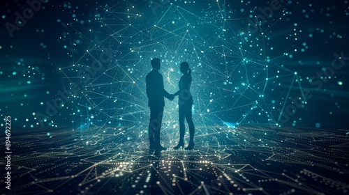 Handshake with wireframe design - Two hands join in a handshake overlaid with a blue digital wireframe, symbolizing technology and agreements