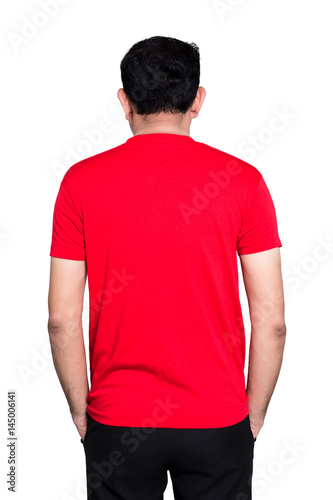 Handsome man in a blank rear red t-shirt isolated on white background.