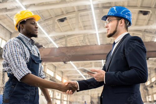 Handsome African American worker wearing overall and hardhat greeting confident investor with firm handshake while standing at spacious production department of modern plant