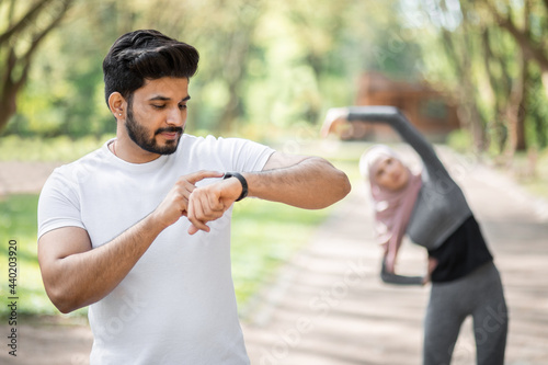 Handsome arabian guy in sport clothes standing at green park with smart watch on hand. Blur background of young woman in hijab warming up before training.