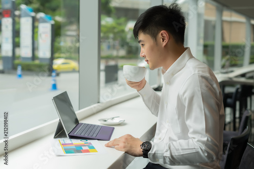 Handsome Asia businessman using laptop and analysis graph visualization at coffee shop