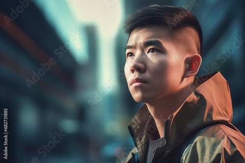 Handsome asian man street photo. Male portrait confident modern person. Generate Ai