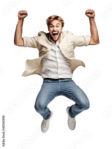 Handsome, attractive young man celebrating. Man isolated in transparent png. Full body, full lenght studio portrait of jumping man