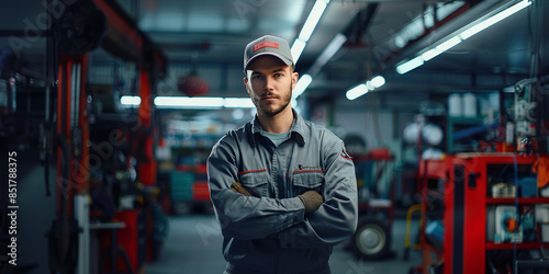 Handsome auto service mechanic in uniform is standing on the background of car with open hood, smiling and looking away. Car repair and maintenance