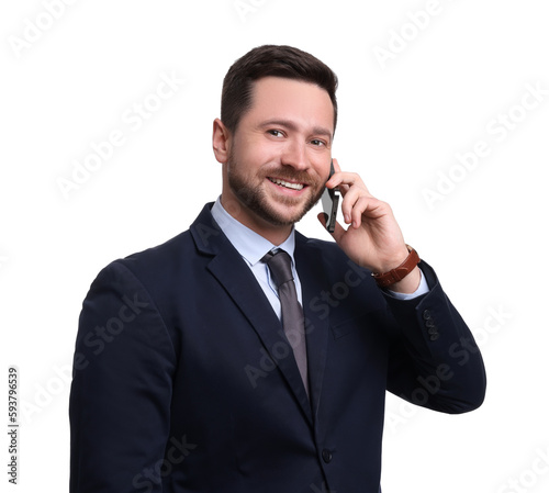 Handsome bearded businessman in suit talking on smartphone against white background