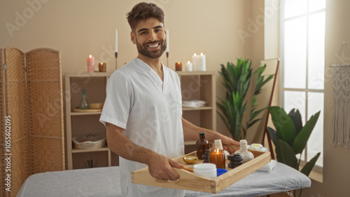 Handsome, bearded man in a spa salon holding a tray with spa items, smiling, and standing in a serene wellness room with candles, plants, and soft lighting