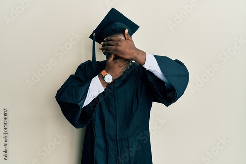 Handsome black man wearing graduation cap and ceremony robe covering eyes and mouth with hands, surprised and shocked. hiding emotion