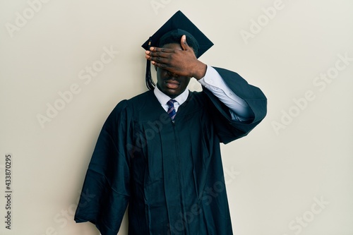 Handsome black man wearing graduation cap and ceremony robe covering eyes with hand, looking serious and sad. sightless, hiding and rejection concept