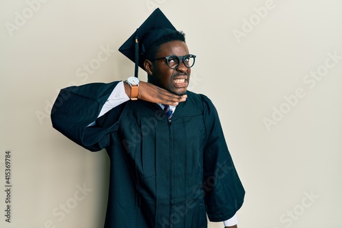 Handsome black man wearing graduation cap and ceremony robe cutting throat with hand as knife, threaten aggression with furious violence