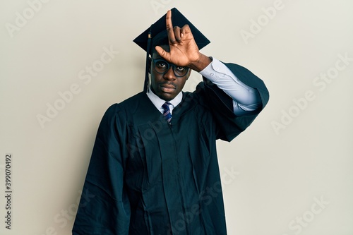 Handsome black man wearing graduation cap and ceremony robe making fun of people with fingers on forehead doing loser gesture mocking and insulting.