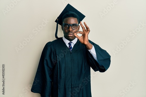 Handsome black man wearing graduation cap and ceremony robe mouth and lips shut as zip with fingers. secret and silent, taboo talking