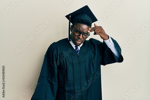 Handsome black man wearing graduation cap and ceremony robe pointing unhappy to pimple on forehead, ugly infection of blackhead. acne and skin problem