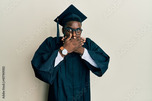 Handsome black man wearing graduation cap and ceremony robe shocked covering mouth with hands for mistake. secret concept.