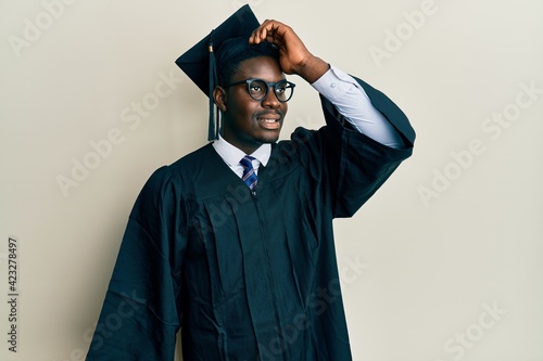 Handsome black man wearing graduation cap and ceremony robe smiling confident touching hair with hand up gesture, posing attractive and fashionable