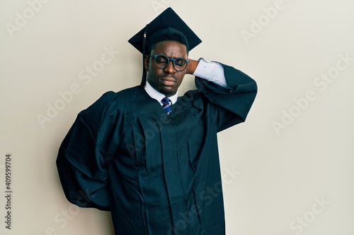 Handsome black man wearing graduation cap and ceremony robe suffering of neck ache injury, touching neck with hand, muscular pain