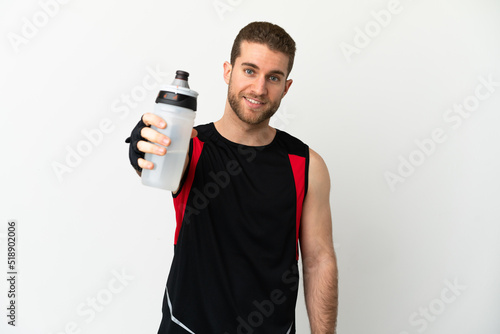 Handsome blonde man over isolated white background with sports water bottle