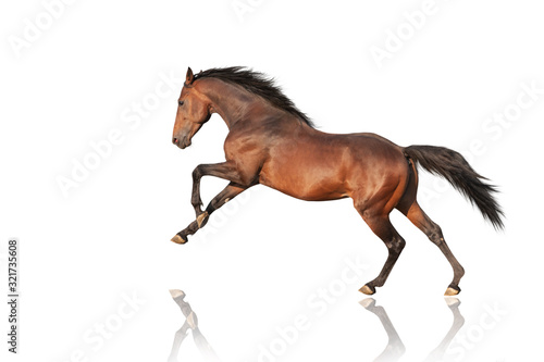 handsome brown stallion galloping, jumping. Thoroughbred horse isolated on white background