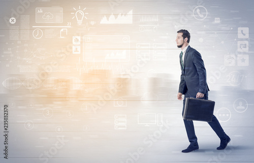 Handsome businessman walking in suit with briefcase on his hand and database concept around