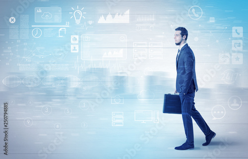 Handsome businessman walking in suit with briefcase on his hand and database concept around