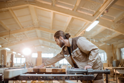 Handsome carpenter in uniform gluing wooden bars with hand pressures at the carpentry manufacturing