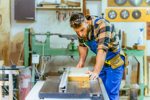 Handsome carpenter preparing, measures and cutting boards on cutting machine