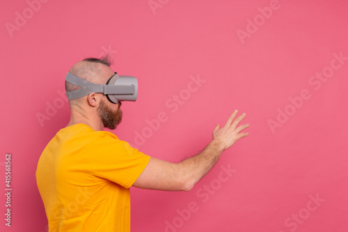 Handsome casual wear men in vr glasses side view pointing to the left text space