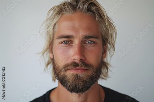 Handsome Caucasian bearded blonde man contented expression and healthy hair looking at camera