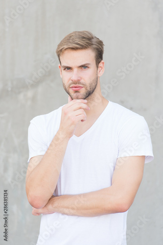 Handsome caucasian man gray background. Ideal traits that make man physically attractive. Bearded guy casual style close up. Male beauty standards. Handsome man unshaven face stylish hairstyle