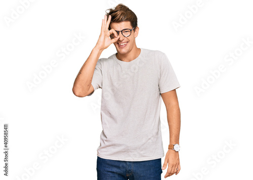Handsome caucasian man wearing casual clothes and glasses doing ok gesture with hand smiling, eye looking through fingers with happy face.