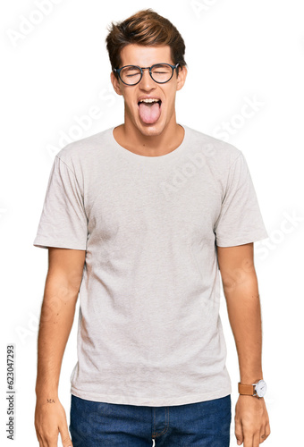 Handsome caucasian man wearing casual clothes and glasses sticking tongue out happy with funny expression. emotion concept.