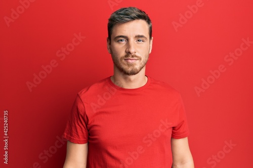 Handsome caucasian man wearing casual red tshirt relaxed with serious expression on face. simple and natural looking at the camera.