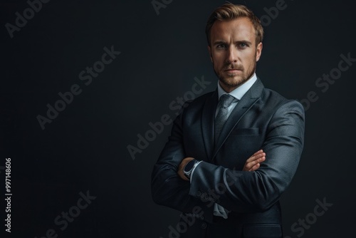 Handsome confident businessman wearing suit standing isolated over black background arms folded