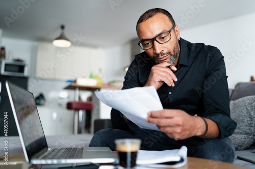 Handsome entrepreneur managing accounts at home