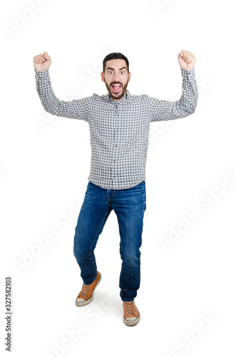 Handsome excited man happy smile, raised arms, sign of victory, young guy casual wear, full length isolated over white background