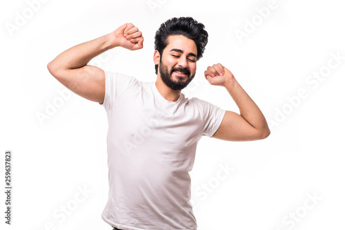 Handsome happy beard arab young man smiling and feeling excited isolated on white background