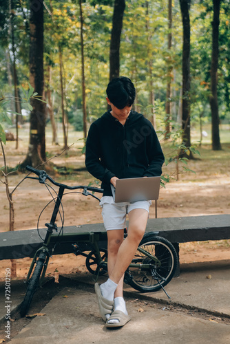 Handsome happy young man with bicycle on a city street, Active lifestyle, people concept