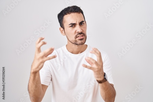 Handsome hispanic man standing over white background shouting frustrated with rage, hands trying to strangle, yelling mad