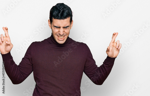 Handsome hispanic man wearing casual turtleneck sweater gesturing finger crossed smiling with hope and eyes closed. luck and superstitious concept.
