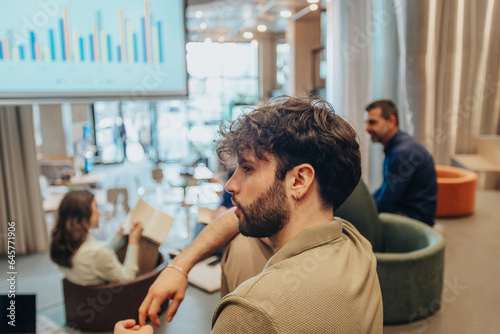Handsome male employee listening to his colleague, discussing at work, side view photo